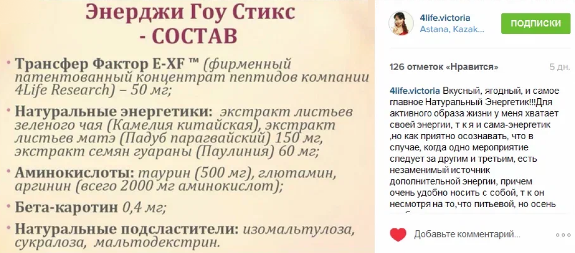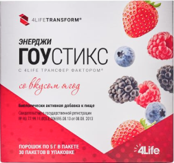 Состав Энергетического напитка 4Life Энерджи Гоу Стикс: глютамин, таурин, экстракт листьев зеленого чая, аргинин, ароматизатор ягодный, экстракт листьев падуба парагвайского, ароматизатор клюквенный натуральный, сок свекольный (краситель), сукралоза (подсластитель), экстракт семян гуараны, Трансфер Фактор E-XF (порошок из коровьего молозива и желтка куриного яйца) - 50 мг/пакет, 1% бета-каротин - 0,4 мг.