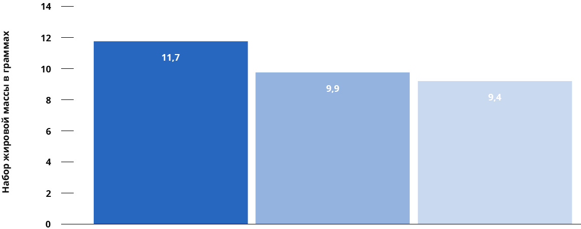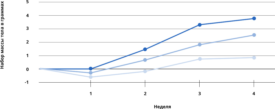За 4 недели 4life Transform™ Бёрн™ уменьшил прирост масы тела на 8%, причём значительный эффект наблюдался уже через три недели. За 4 недели 4life Transform™ Бёрн™ и ПРО-ТФ уменьшили набор массы тела на 11%, причем значительный эффект наблюдался уже через две недели.