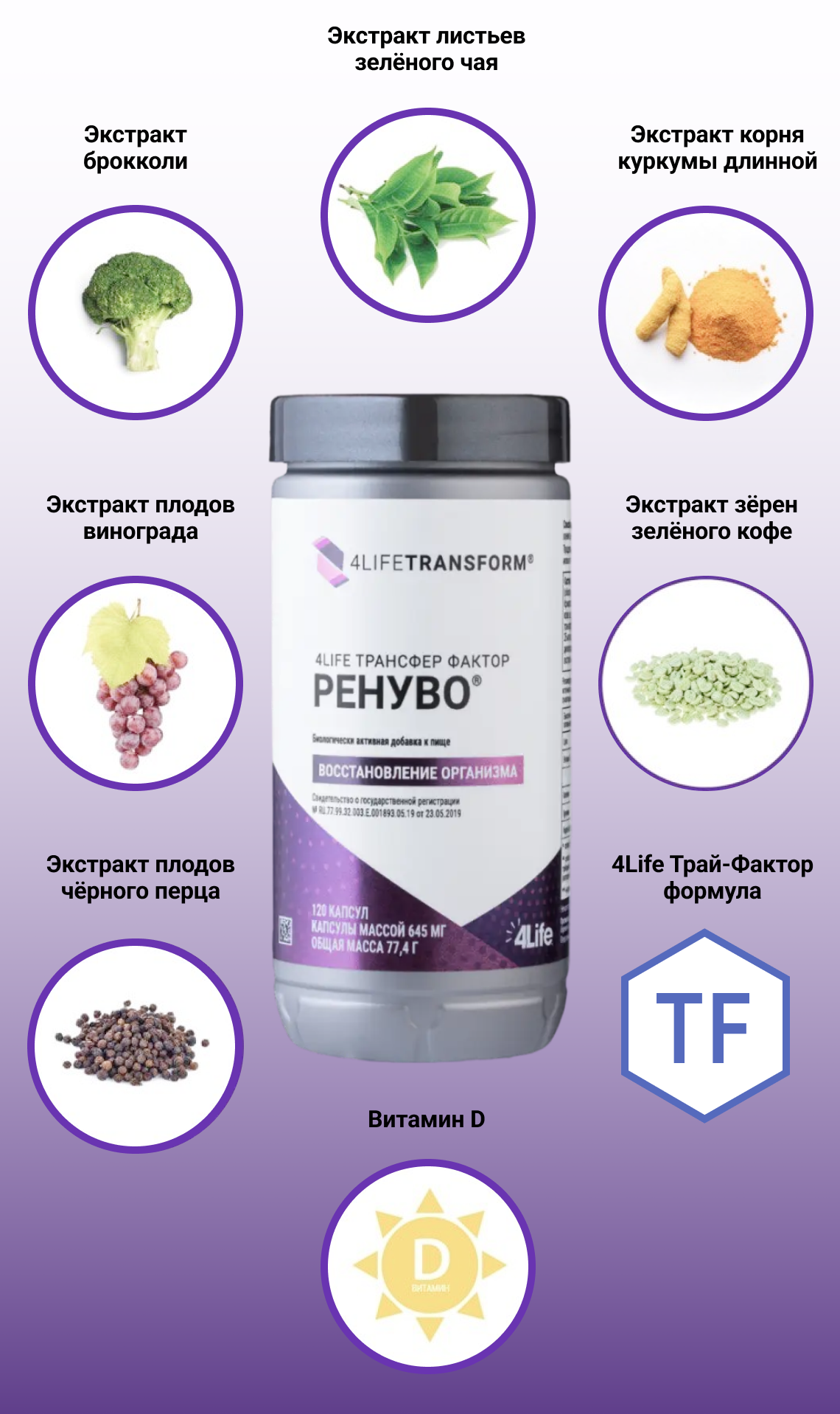 Помимо природных адаптогенов в состав Ренуво входит Трай-Фактор формула – один из самых передовых ингредиентов для восстановления иммунной системы.