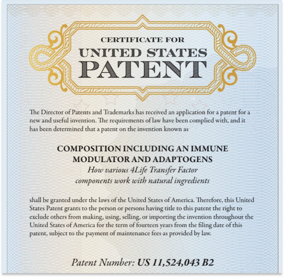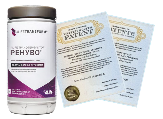 Защищен патентами США 6,468,534 (процесс экстракции трансфер-факторов из яичных источников) и 6,866,868 (процесс соединения трансфер-факторов из коровьего молозива и яиц куриных яиц).