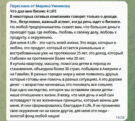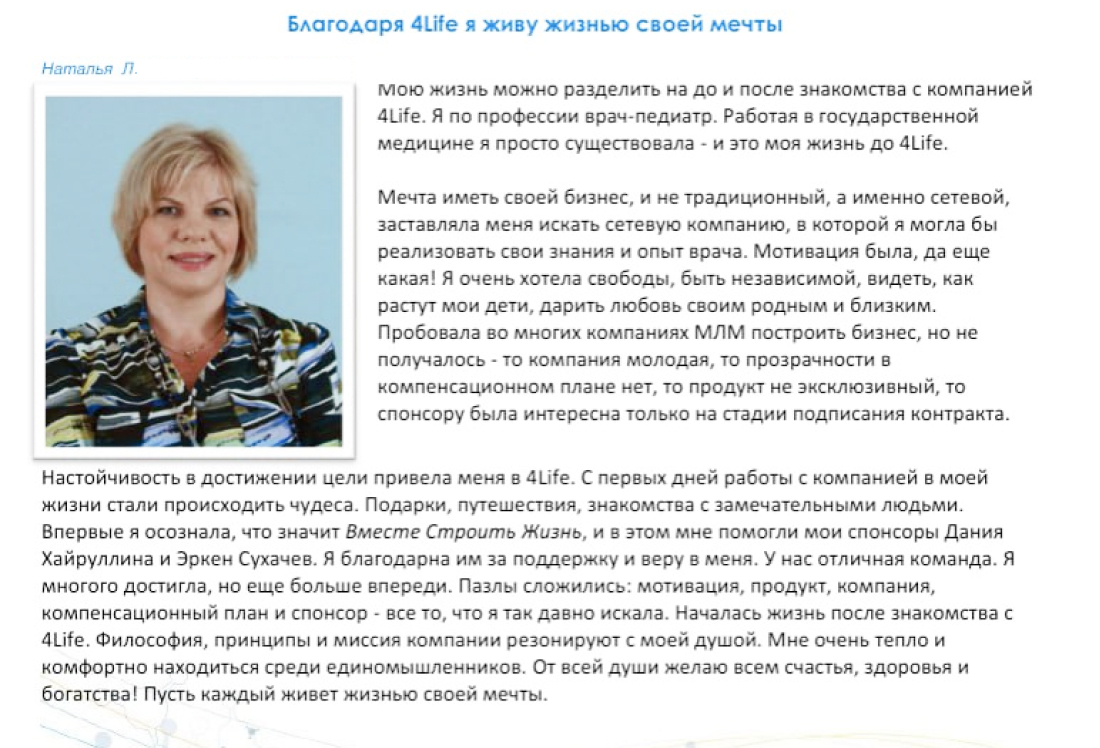 В этом проекте я смогла создать дело, которое помогает окружающим меня людям быть здоровее, обеспеченными, быть защищенными от непредвиденных экономических ситуаций. Я купила элитную квартиру, много путешествую (посетила более 30 стран ). Дала хорошее образование детям. Более 20 лет бизнес с 4Life приносит мне достойный доход, позволяющий уверенно чувствовать себя в наше нестабильное время.