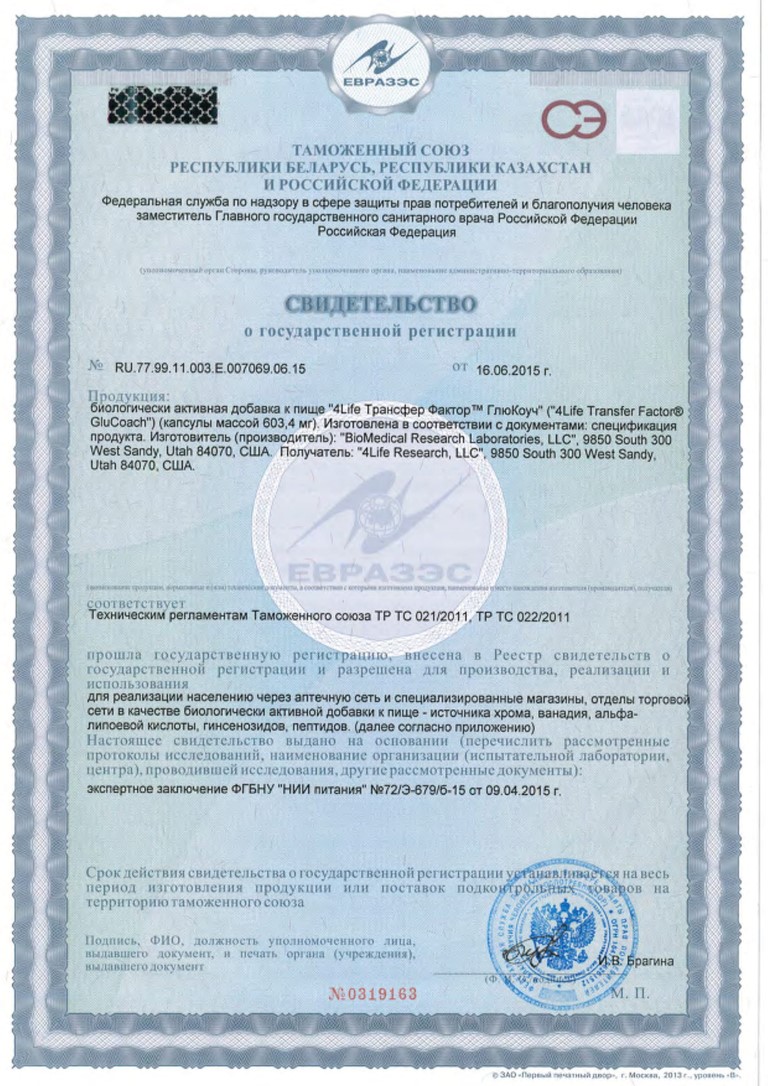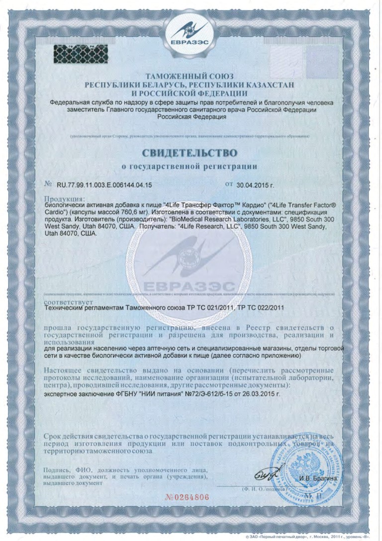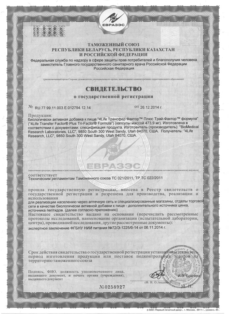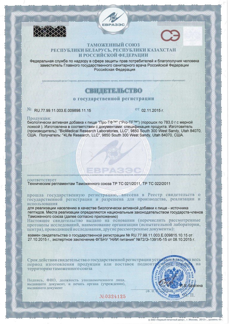 Патенты, Сертификаты, Экспертные Заключения и др. документация на продукцию 4Life Research: